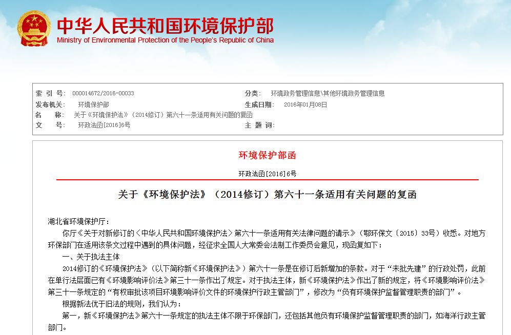 关于《环境保护法》(2014修订)第六十一条适用有关问题的复函(节选)