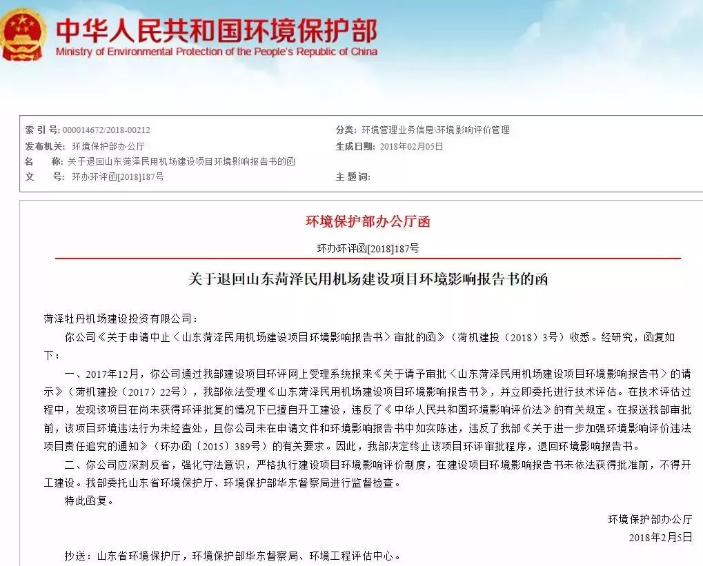 一、2017年12月,你公司通过我部建设项目环评网上受理系统报来《关于请予审批〈山东菏泽民用机场建设项目环境影响报告书〉的请示》(菏机建投(2017)22号),我部依法受理《山东菏泽民用机场建设项目环境影响报告书》,并立即委托进行技术评估。在技术评估过程中,发现该项目在尚未获得环评批复的情况下已擅自开工建设,违反了《中华人民共和国环境影响评价法》的有关规定。在报送我部审批前,该项目环境违法行为未经查处,且你公司未在申请文件和环境影响报告书中如实陈述,违反了我部《关于进一步加强环境影响评价违法项目责任追究的通知》(环办函〔2015〕389号)的有关要求。因此,我部决定终止该项目环评审批程序,退回环境影响报告书。