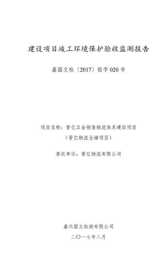 2017年8月18日,晋亿物流有限公司组织召开晋亿五金销售物流体系建设项目(晋亿物流仓储项目)竣工环保设施验收现场检查会。验收小组由属地政府(嘉善经济开发区管委会)、工程建设单位(嘉善荣达建安公司)、环评单位(嘉兴求是环境工程咨询有限公司)、监测单位(嘉兴国文检测有限公司)并特邀3名专家(名单附后)组成。